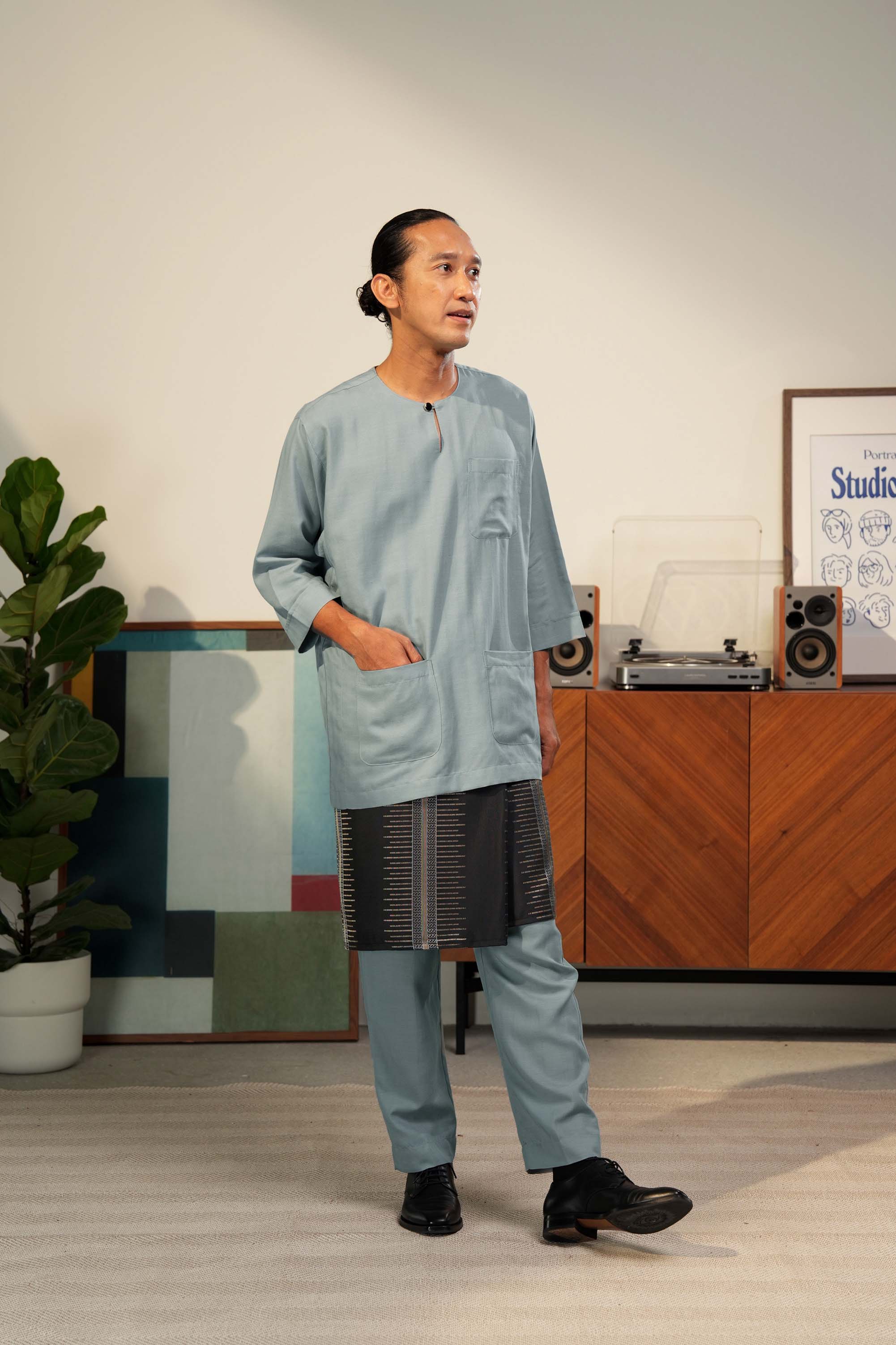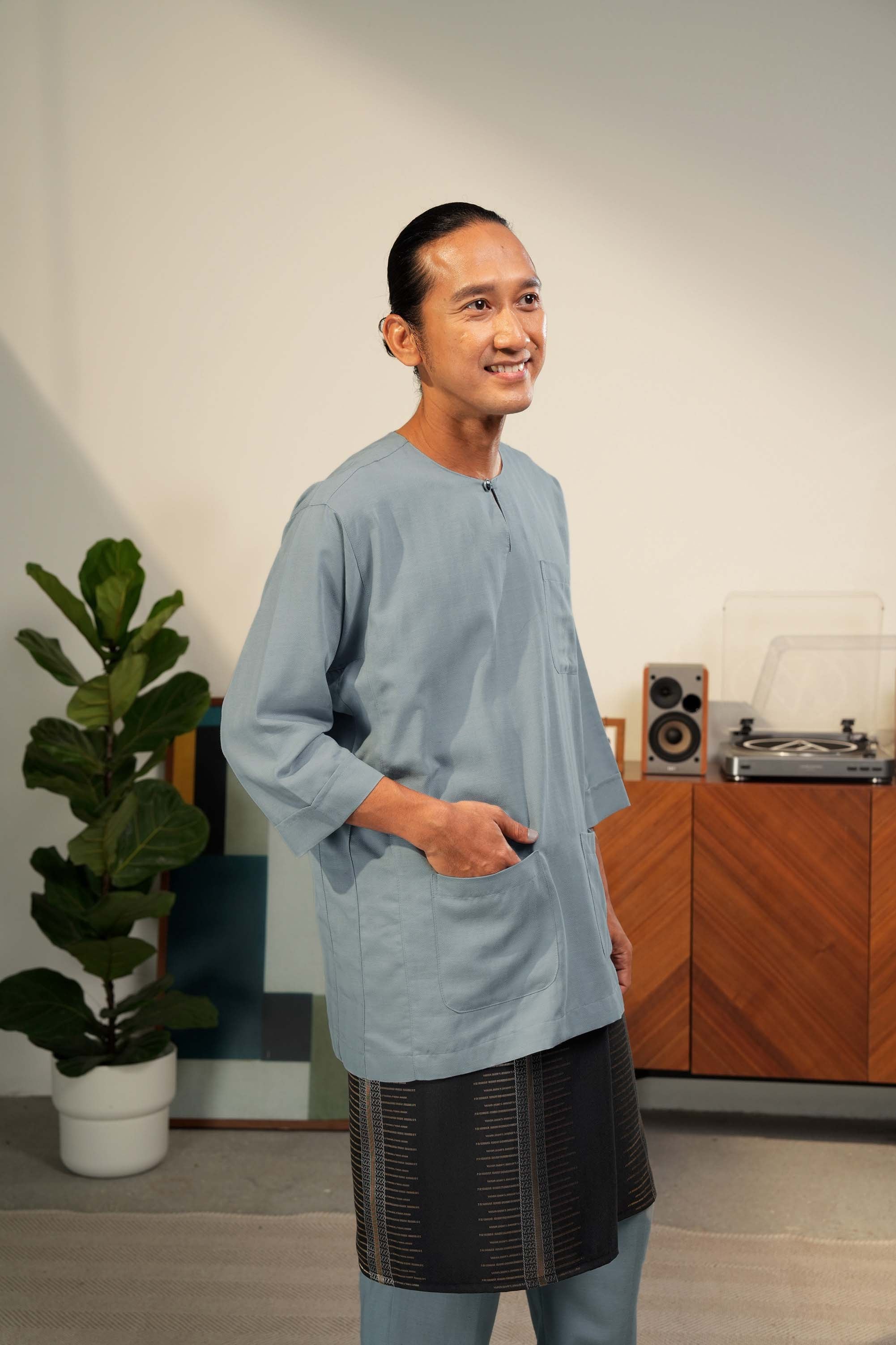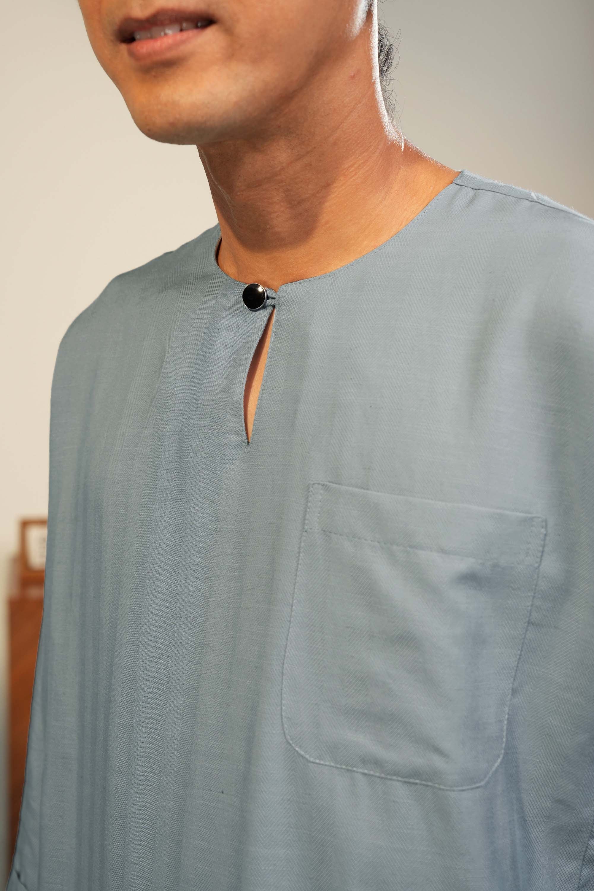 Baju Melayu Artisan Teras is a timeless classic redefined with comfort and effortless sophistication, and was tailored in a classic fit silhouette. Designed with traditional pesak and kekek design elements, this piece preserves authentic Malay tailoring details while ensuring ease of movement and superior comfort. The three-quarter-sleeve length adds a modern touch, giving it a versatile and slightly contemporary edge. Its loose-fit cutting enhances comfort without compromising the structured, masculine look.